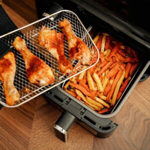 Pommes, Fisch oder Filet für zwei, vier oder sechs Personen oder mehr? Der ONYX COOKWARE™-HEISSLUFTFRITTEUSE hat ein Fassungsvermögen von 4+4 Litern und doppelten Körben und gehört damit zur Kategorie der großen Luftfritteusen.