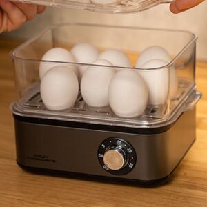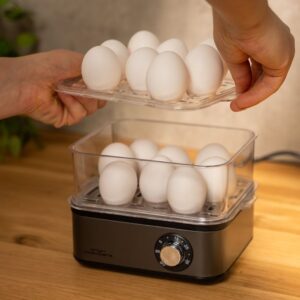 Mit dem ONYX COOKWARE™ MULTIFUNKTIONALEN EIERKOCHER kannst du bis zu 16 Eier gleichzeitig zubereiten – einfach und ohne Aufwand. Füge einfach Wasser hinzu, schalte die Maschine ein und warte auf das Signal, das dir sagt, dass die Eier fertig sind.